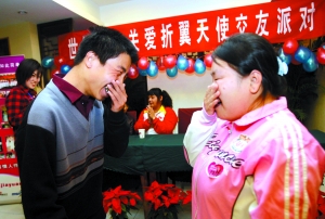 昨日上午10时,相亲会正式开始。50余名残疾人拿起小纸条,填上基本情况后,跟着主持人玩起“幸福拍手”游戏,他们希望遇到属于自己的缘分。