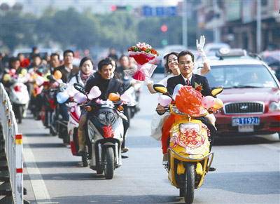 昨天上午,广西柳州市的陈海泉和亲朋好友一起骑着10辆电动车去接新娘黄秋菊。