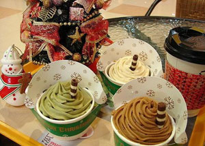 上面有用以鲜奶油调和层层交迭的栗子泥、抹茶跟焦糖馅,并在顶端洒上雪白的糖粉,呈现充满冬季耶诞氛围的白朗峰造型。最后插上可爱的脆笛饼干,搭配雪花点缀的杯身,好像一棵棵美丽的圣诞树一般,尤其搭配圣诞餐桌更有FU~。