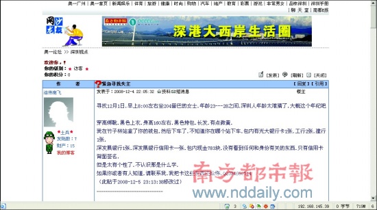 “年龄23-28岁之间,穿高帮靴,黑色上衣,身高160cm左右,黑色挎包,长发,有点微黄。”“浩伟南飞”在帖子中写道,他于12月1日早上8时左右乘坐204路普巴,在竹子林站拿走了这位女士的钱包,现在十分后悔。他说,包内有光大银行卡1张、工行卡2张、建行卡1张等,现金783元。他在网上留下了自己的QQ号,希望知情者与他联系。