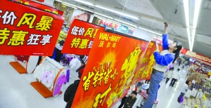 昨日(12月11日),零售巨头沃尔玛宣布从今日起开始规模化降价促销,商品最高降价幅度达20%。图为沃尔玛北京宣武门分店内,一店员正在悬挂海报,为即将开始的促销做准备。