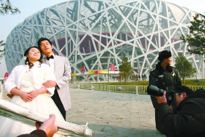 昨日,鸟巢外,来自牙买加的游客戴文被这对新人吸引,在听志愿者简单讲述了两人在地震中的遭遇后,他伸出手握住了贺晨曦和郑广明,并希望与他们合影。