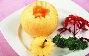 2. 梨洗净削皮,从蒂部往下1/3处打横切开做盖(有心思的话可切成锯齿状),挖去内核;