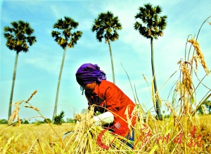 柬埔寨农民正在收割水稻。柬埔寨的大片农田将成为主要海湾国家的粮食基地