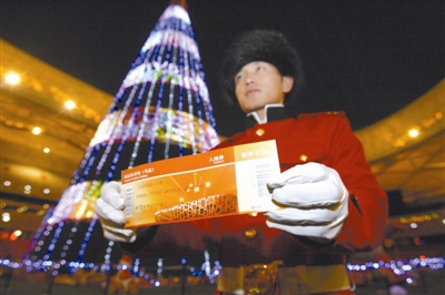 国家体育场“鸟巢”昨起正式启用新票样。此外,从昨天起到明年1月10日,“鸟巢”每天的闭场时间将延后一小时,由原来的18时延长至19时。(金可/摄)