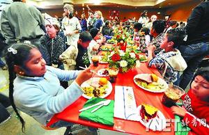 12月24日,圣诞节前夕,在美国加利福尼亚州洛杉矶市一慈善机构内,数千名儿童享用着该机构提供的圣诞大餐