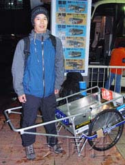吉田正仁准备利用手拉车徒步穿越欧亚和非洲大陆,27日凌晨摄于JR鸟取站前。