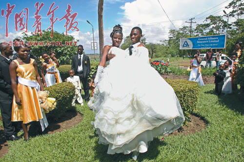 利隆圭。在众多的亲友面前,新郎官抱起新娘拍摄结婚照