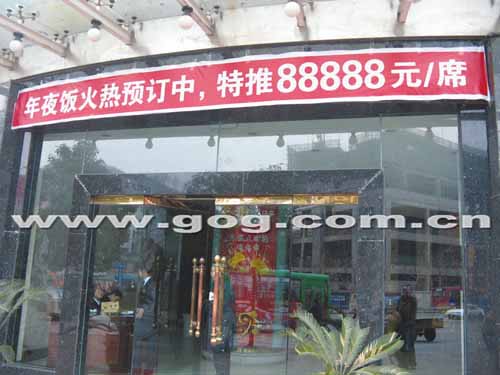 12月29日,记者接到热线报料后,前往该酒楼采访。天价年夜饭的广告打在酒楼大门上方(如图),引来过往路人纷纷驻足观看。