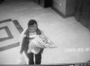 女子进了大门后,左右张望了一下,神情紧张,随后匆匆朝大厅走去。一分钟后,女子听到楼上的喧哗声,立即退到刚才的门口,站在两台查询机旁边,一边等待,一边不时低头看一看手中的孩子,轻轻哄一哄。又过了一分多钟,女子快步抱着孩子从摄像头下方走过,朝电梯间方向去了。