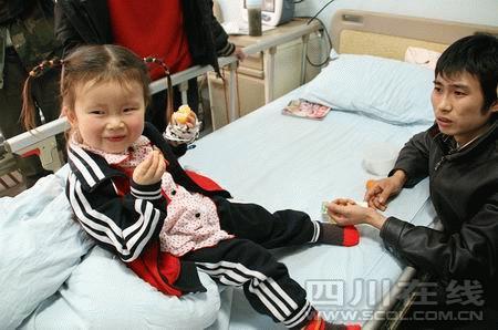 昨(11)日下午,华西医院第一住院大楼8楼,3岁零7个月的小女孩吴苹,被妈妈抱着站在窗口前,对着楼下川流的车辆高声喊:“车车等等我,带我回家看奶奶!”稚嫩的童音在病房里回荡,大人们听得心酸。和孩子当了一个多星期的病友,大家都清楚,那根从她腹部暴露出来的分流管,随时可能将致命的细菌顺着管子送入她的头部,将这个可爱女孩的生命带走。
