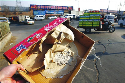 昨天下午,记者见到了这种纸箱。在箱子底部,贴有一张黄色草纸,摸起来凹凸不平。拿刀子割开草纸发现,纸箱底部沾着一层“腻子饼”,直径约一尺,厚约3毫米,尚未完全干透。记者从市场内找了一台电子秤测量,这个特殊的箱子质量有2斤1两,而与之相同的一般纸箱不到一斤。