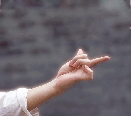 “外指式”如在《游园惊梦》中杜丽娘唱“荼蘼外烟丝醉软”时,即用此式。