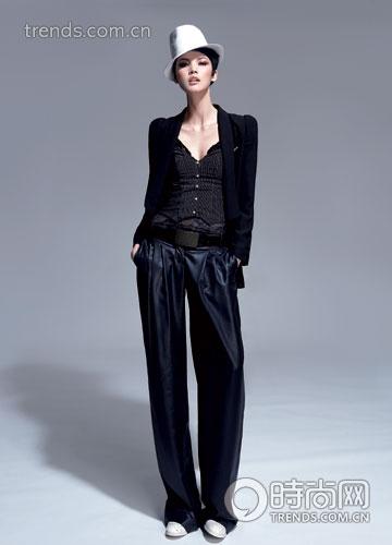 全黑色系的衣装组合与白色配件的辅助,是中性感内衣外穿的最IN组合。