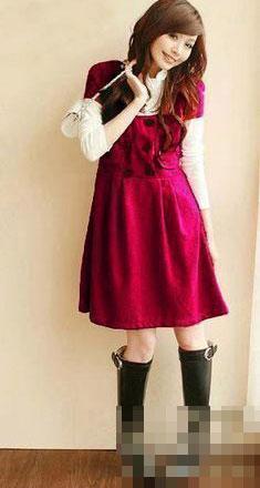 红色的连身长裙切合了2月新年的气氛,也显示出白羊座女生热情且天真的性格,黑色尖头长靴穿出修长美腿,稍微露出的小腿显得不落俗套。如果加上长袜,就显得累赘了,要小心喔!