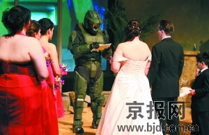 美国一对新人日前举行“光环”主题婚礼。两人于2004年12月在玩网络游戏《光环2》时相识。证婚人装扮成游戏里的角色为他们主持婚礼。
