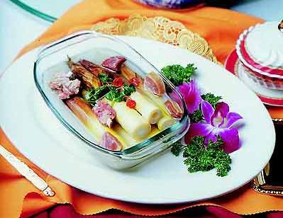 (5)春笋:被誉为“素食第一品”的春笋作为美味佳肴,自古以来备受人们喜爱。文人墨客和美食家对它赞叹不已,有“尝鲜无不道春笋”之说。春笋笋体肥厚,美味爽口,营养丰富,可荤可素。做法不同,风味也各异,炒、炖、煮、煨皆成佳肴。地方名菜春笋均占一席之地,如上海的“枸杞春笋”,南京的“春笋白拌鸡”,浙江的“南肉春笋”。不过,北方很难吃到新鲜的春笋,如果是弗尔玛林里泡过的就算了吧。