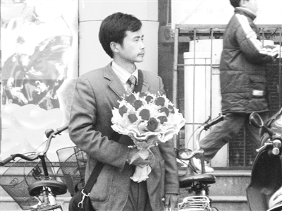 昨日上午9时许,记者在余家头武商量贩店门口看到,一个身体单薄的、穿蓝色西装的小伙子,手捧鲜花和礼品,在街头等自己心爱的人已经3天3夜了。记者看他面容已经显得有些憔悴,但是在记者和众人的劝说下,他依然不愿离开,还要在那儿继续痴痴地等待(见图),以这种近乎疯狂的求爱让“女友”回心转意。