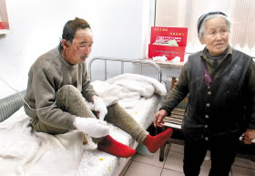 昨日,记者来到长春烧伤医院,见到了母子两人。42岁的崔某头部、面部、双手等处被烧伤,双手缠着厚厚的纱布。崔某83岁的母亲一直在病房内照顾儿子。