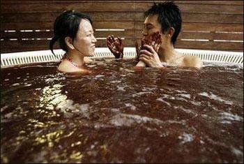 一对日本情侣在享受巧克力温泉浴。