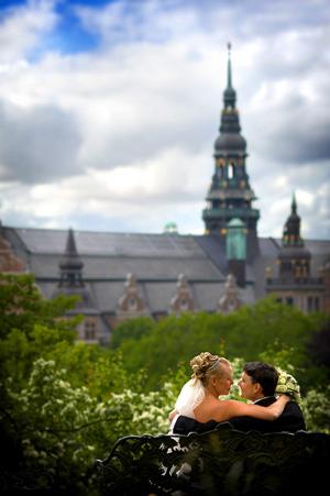 瑞典新婚夫妻享受着博物馆花园的恬静。