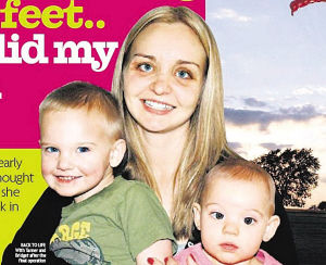 2005年10月9日,时年21岁的美国姑娘莎娜·里查森在阿肯色州高空跳伞时,因主副降落伞都无法打开,她就像秤砣一样从3000多米高空坠落地面。脸先着地的莎娜奇迹般地没有摔死,就连腹中2周大的胎儿也安然无恙!孩子安然出生后6周,莎娜便重返蓝天再次跳伞。3年后,莎娜又增添了一个宝宝,并于去年12月通过第6次整容手术重获了“新脸”。