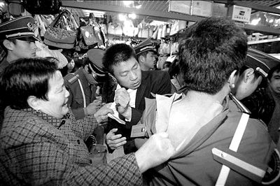 由于事先已得到将被封摊的消息,摊主的“亲友团”特地赶来助阵,地下一层编号为F4-0020的摊位前,一位身材矮胖的六旬老太来为儿子护摊。看到保安接近儿子的摊位,她冲了出来,首先将两名保安推搡了出去。随后,她又回过头来拽其余的工作人员。无奈对方人多,顾得了这个顾不了那个,老太太心急之下,身子一沉坐在了地上,大喊“你们让不让人活了……不让卖,我们吃什么啊……”