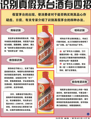 据她介绍,茅台酒厂目前在北京专设了多名打假人员,通过明察暗访的方式,寻访假酒的线索。一旦发现假酒,将举报工商部门或以法院起诉的方式“打假”。她说,目前打假人员还是主要针对高档餐厅、酒店和超市进行打假。对一些小的烟酒店所卖的假茅台酒,他们暂不作为“打假”重点。莫律师承认,目前在市场上存在着大量假茅台酒,但针对“出了贵州,就喝不到真的茅台”和“茅台酒中80%是假酒”的传言,她表示假酒并无传言中的那样多。