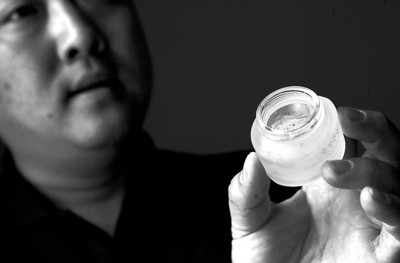 在张四林暂住的旅店里,记者看到他带来的几件样品,都是膏、霜类产品。产品的包装很精美,保质期均到2010年,都没有拆过封,但是玻璃瓶里的东西都少了几乎一半。记者打开其中一瓶 “防皱眼喱”,这霜状的化妆品摸上去已经发硬,挖一点下来涂在手背上,竟搓出一丝一丝的白色物体,根本不能融开。另外一瓶“嫩肤霜”,则几乎成了块状。
