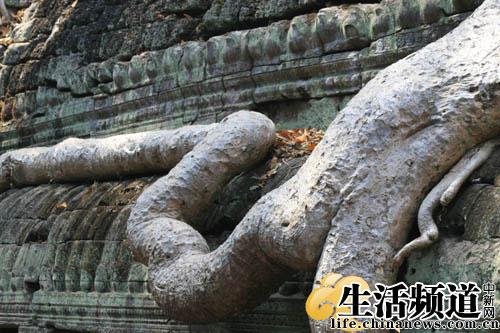 19世纪中叶,法国人发现塔普伦寺之后,即因整座寺庙已被树根茎干极度纠缠盘结、难以清理而放弃整修,保持了原始模样,由此形成了塔普伦寺林寺一体的独特景象与标记。被当地人称为“蛇树”的卡波克(Kapok)树的粗大根茎,确如大蟒蛇一般盘绕、穿透、纠结,气势贲张,与神庙血肉相融、爱恨纠缠一般难舍难分,映入笔者眼帘,基本能领略当年探险家眼见的吴哥世界。几年前Angelina Jolie 就在这里拍了电影《古墓丽影》,取了著名的“树包屋”镜头。
