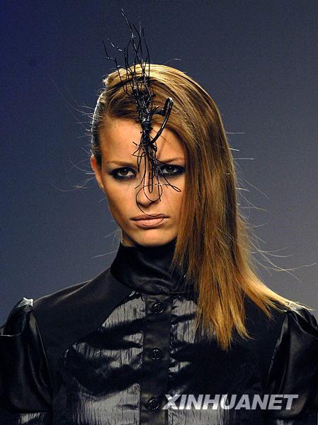 在第49届马德里时装周上,模特头部的各种精心修饰使得时装设计师的作品得到了更好的诠释。新华社记者陈海通摄