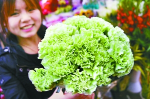 绿色代表健康、充满活力。大家通常看到的康乃馨大都是红、黄、粉为主,绿色康乃馨因培植技术复杂等原因,极其罕见。在追求环保、简约、时尚的三八妇女节为女性朋友送上一束绿色的康乃馨别有一番寓意。(刘洁摄)