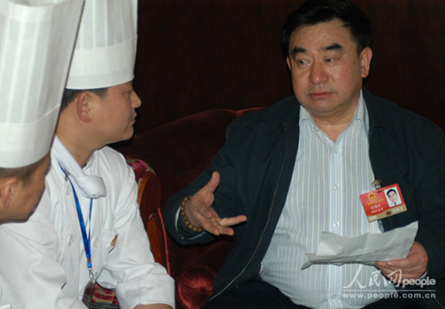 全国人大代表、湘菜大师许菊云与酒店大厨在进行交流。人民网记者 李昉 摄  人民网北京3月3日电 (记者 李昉) 食品安全事故的发生,在一定程度上对消费者造成恐慌,让民众对食品安全产生信任危机,这也成为了今年两会广泛关注的话题之一。那么,如何才能堵住食品安全生产漏洞呢?全国人大代表、湘菜大师许菊云建议严把源头、餐桌、意识三道关。