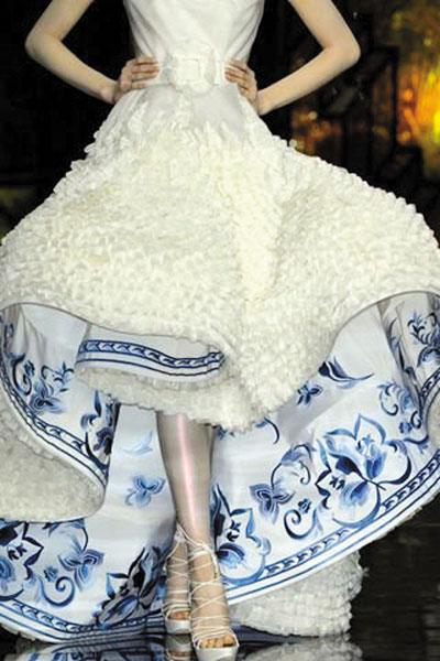 Christian Dior本次高级定制中,多次见到青花的痕迹,从内到外。