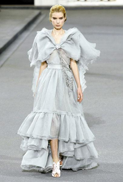 飘逸的雪纺洋装以浪漫的荷叶边及柔美的蝴蝶结点缀。