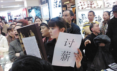 “三八”节本该是妇女的节日,然而这一天重庆解放碑闹市某商场却出现了一名漂亮女子举纸条讨薪维权的场面,惊动了110民警。原来,这名讨薪女子是广州一家公司驻该商场的营业员,因未接待顾客被公司罚款100元,拒交后又遭到调岗处理。双方关系“拉爆”后,遂来到商场追讨千余元欠薪。昨天,经渝中区劳动局介入,当事双方已达成协议,公司方面支付了她3年多的保险金,欠薪也即将支付。