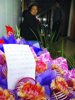 赵蕾的病房外摆满了鲜花,人们等待着奇迹的发生