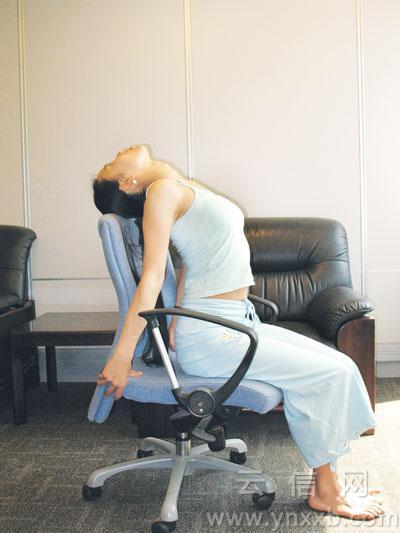 动作要领:坐在椅子二分之一处,双手向后弯曲,握住椅子背部。身体保持正直,两肩向后扩展打开,收腹,呼气上背后仰,胸部尽量向前挺起,头部放松靠在椅背上,眼睛注视天花板或闭上双眼,保持此姿势10秒钟。