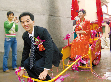 当日下午2时左右,石头村接龙桥到慈湾村的小道上,鞭炮齐鸣,笑声不断。西装革履的新郎正奋力拉着一辆自制的两轮人力车,人力车上端坐着漂亮的新娘,红彤彤的礼服映红了新娘的脸。新郎是棠下镇石头村委会慈湾村人,在棠下工业区的一车厢厂工作,新娘是环市街道办丹灶村人,两人已经相识一年,当日喜结良缘。