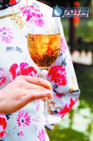 为了能静心品味花茶的独特,记者来到了位于流花湖畔的流花茶艺城,装修古色古香,从室外到室内,从亭、台、楼、阁、到柜、箱、桌、椅、茶具,均以中国传统的大红为基调,而面对着这样广阔优美的湖天一色,舒畅自在地呼吸着清新的空气,聆听着传统的古筝乐曲,身心放松,心境安宁。