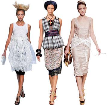 2009春夏,围裙终于摆脱了“厨房里的必需品”的命运,有幸站上了时尚的T台,想必十分荣耀。它决心雪洗从前油迹斑斑的污浊形象,走出厨房。看看Marc Jacobs和Prada裙子上的腰部围裙点缀,是为了凸显迷人腰部线条,而非烹饪需要。