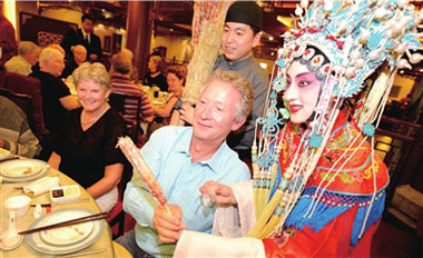 昨晚7点,在前门全聚德烤鸭店,京剧、川剧变脸和老北京的糖葫芦,让来自美国的130余名游客感受了一把地道的中国风。而这也是今年以来,该店接待人数最多的一个外国旅游团队。(记者范继文 胡笑红摄影报道)