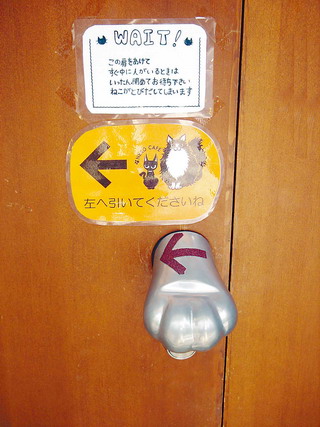 到了店口,只见橘红色门前缠绕鲜花的栅栏,一片田园风格,还没进门,就听到了猫咪“喵呜喵呜”的招呼声,门口一只“猫咪服务员”主动跳出来欢迎我们。在“猫咪服务员”的带领下,我们走进咖啡厅,这里简直是猫咪的乐园,几乎一切都跟猫有关:八九只猫咪分散在各个角落,有在吧台上打盹的,有在地板上伸懒腰的,有在积木式的书柜隔间只露出脑袋的;藤编的篮子里装满猫咪喜欢的小玩意,毛线球、绳铃等;两处白色攀爬树,几处矮矮的座椅,靠背都有猫抓的痕迹;墙上挂着各种猫咪的照片,指路牌上画着猫咪的卡通漫画,就连门把手都设计成向外伸出的猫爪造型。