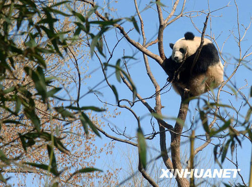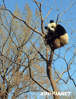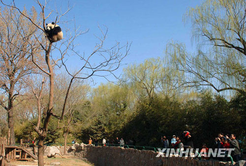 3月22日,北京动物园熊猫馆的一只熊猫爬到高高的树上,它憨态可掬的模样吸引了很多参观者驻足观看。(新华社记者 公磊 摄)