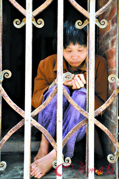 巷子内人很少,只有一两个水泥工在修葺房子。走近15号房门,记者猛然看见一个30多岁的女子坐在门内,而金属门却被紧锁,里面的两扇木门半掩,从内向外散发出一股霉味,老屋内光线昏暗,摆着陈旧的凳椅,没有其他家具。阿巧坐在地上,似乎并没有觉察到有人到来,呆滞地数着手指。