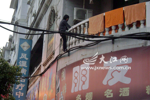 记者李桂明摄影报道:26日18时许,一名女子因遭到男友冤枉,一时想不开爬上了萍乡玉溪宾馆三楼阳台外墙上跳楼。经过民警劝导,30分钟后,该女子放弃了轻生念头。