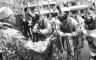 下午2点,幽幽的古乐响起,着汉服的数位老人和18位青少年再现古时成人礼。“请行冠礼,”在洪亮声音下,长者们为青年戴“冠”并整理端正。18位青年向父母行大礼,感谢养育,再向师长行大礼,感谢教育。据了解,成人礼自周代就有,当时称为“冠笄之礼”,男孩行“冠礼”,女孩则行“笄礼”。60岁老者罗世明穿着汉服下台来,他是行礼的长者,“现在年轻人似乎已忘了传统道德和礼仪,希望他们从国学文化中重新了解中国传统文化,端正自己。”