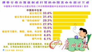 该调查显示,33.6%的中国高中生曾“被父母打骂”,29.3%被“烫伤或烧伤”。对于父母是否有权利打骂孩子,各国高中生的态度不一。85.0%的中国高中生反对“父母打骂孩子是自家的事,别人没有权利干预”,在四国中比例最高。