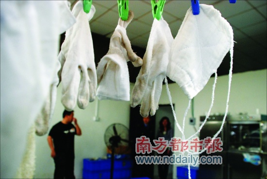 “要客户收货,就一定要让所有的餐具上不能有一点油渍和残渣,所以餐具打包装之前,一定要用手套或毛巾擦干净。”老板娘对记者说。然而,用于擦拭餐具的手套、毛巾都是随处摆放,有的挂在电风扇上,有的甚至放在地上。大部分手套的指尖部位都已经发黑,甚至磨破了。