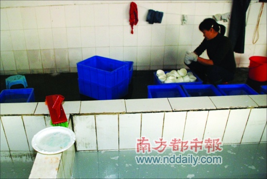 在这些水池旁边,还有四五个盛满水的蓝色塑料箱,有一个箱子里表面上浮着泡沫,另外几个的水则相对较清。这些塑料箱里均放满了各种餐具,旁边的地上还放着各种餐具,三四名女工正围着这些塑料箱洗碗。一名女工表示,箱子里分别是洗洁精、漂白水和清水,用洗洁精洗过后,放在漂白水里漂两次,再在清水里涮一下就行了。记者发现,箱子里的水长时间不更换,即使是清水也有一股浓浓的异味。
